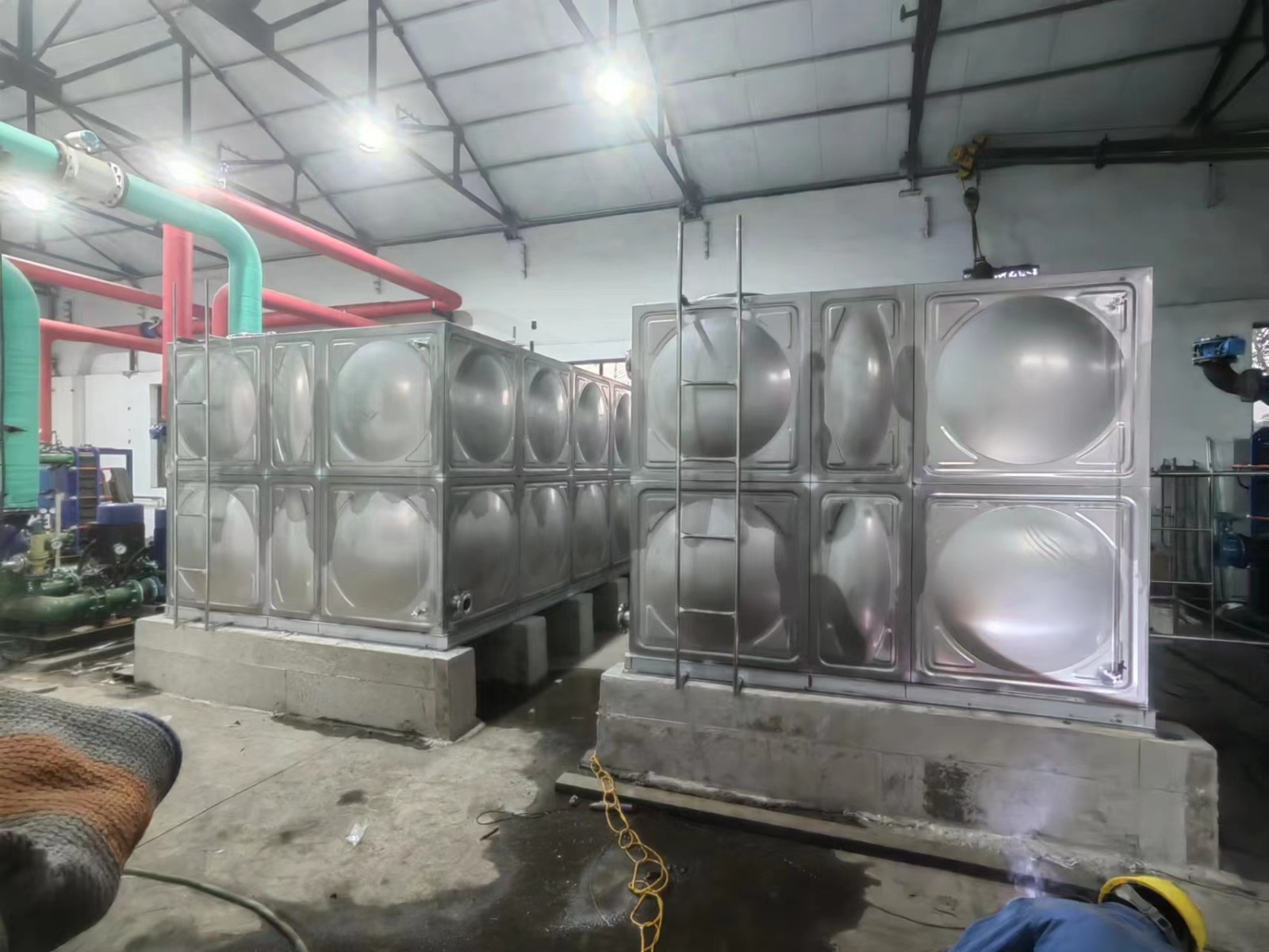 不銹鋼水箱施工方便快捷:標準沖壓板塊1000×1000、1000×500、500×500mm隨意裝配現場組裝焊接,無需吊裝設備。