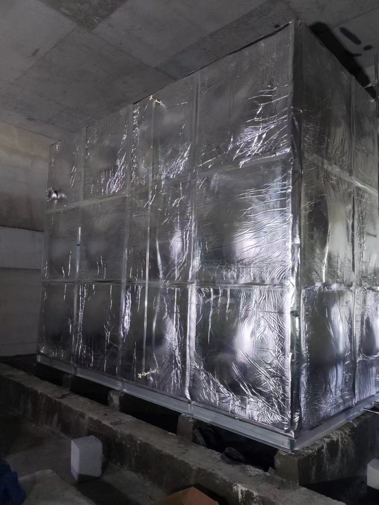 我司承接的山西省大同市中建三局職業(yè)技術(shù)學(xué)院辦公樓屋頂高位消防水箱項(xiàng)目,已經(jīng)安裝試水完成。此水箱為高位鍍鋅鋼板消防水箱,外表做了橡塑鋁箔布保溫層,鋁箔橡塑保溫材料為閉泡式結(jié)構(gòu),且表面平整光滑,所以外界空氣中的水汽很難滲透到材料之中,保冷保溫不必再添加隔汽層,從而獲得較佳的導(dǎo)熱系數(shù),它的陰濕因子大于4.5×103,使它的整體既是保溫層又是防潮層。因此適用于多種防火要求較高的場(chǎng)所使用。